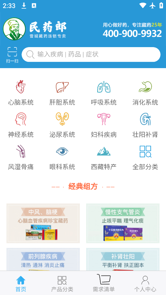 4、点击底部产品分类,在左侧选择疾病系统,右侧会自动显示对应的藏药产品与经典组方。