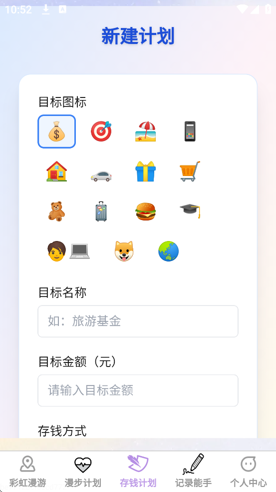 2、存钱计划:支持用户新建储蓄目标项目,设置具体金额上限、完成期限及自动提醒等个性化参数。