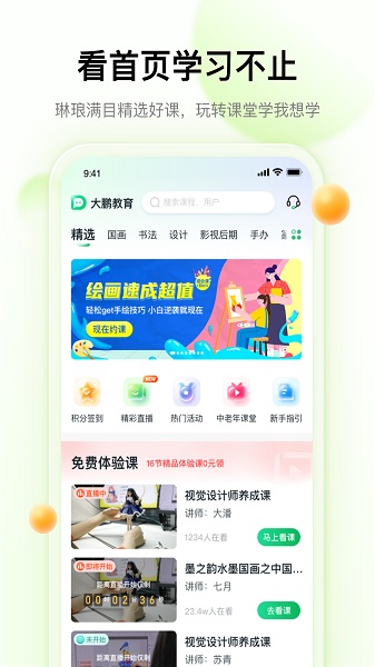 大鹏教育App是一款专注于成人兴趣教育的在线学习平台,提供设计、美术、国画、书法、钢琴等多元化课程,支持直播授课、课程回放、作业辅导和互动社区,适合不同基础的用户随时随地学习提升。