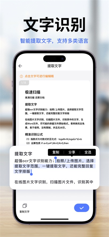1、文档扫描与OCR文字提取:支持手机拍摄纸质文档,自动矫正边缘并去除背景,生成高清图片或PDF文件;可识别图片中的文字,支持多语言(如英文、日文)和逐字/段落复制编辑。