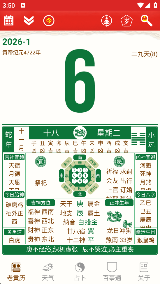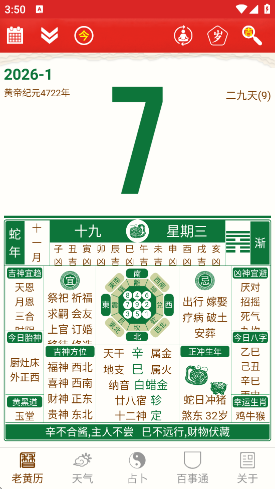 3、每日宜忌、神煞方位、时辰吉凶一目了然。