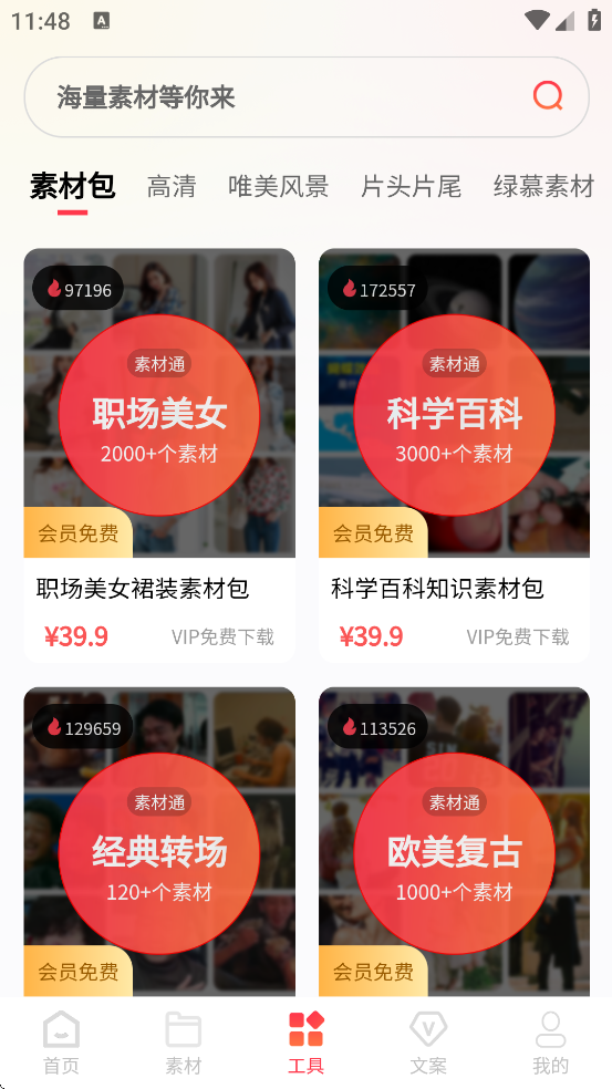 素材通软件安卓版下载安装是一款实用工具软件,软件内为用户提供丰富的高清素材包,用户可以通过软件一键丰富自己的视频内容,同时软件内为用户提供精选视频教程,这么好用的实用工具软件,你还等什么?感兴趣的小伙伴快快下载前来使用吧!