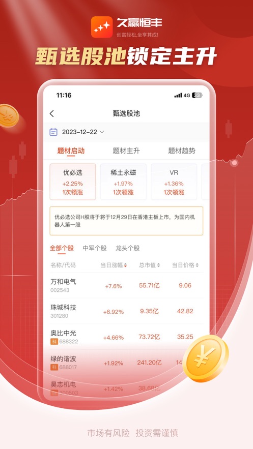 久赢恒丰是一款以证券投资咨询为核心的移动应用,帮你快速把握市场热点、精选潜力题材,还能深度解析公司逻辑,避免踩坑。它提供实时行情数据、精选股池和视频讲解,帮你省时省力做决策。支持iOS和安卓,功能包括题材库、自选股管理、行情数据和股票排行等。