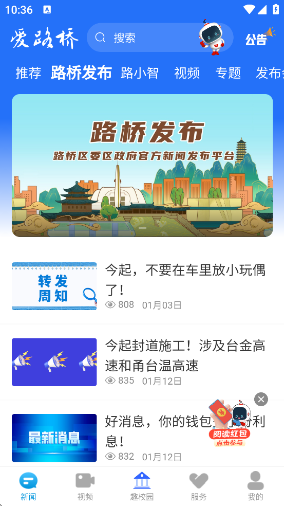 爱路桥APP是台州市路桥区的官方新闻与生活服务平台,帮你一站式搞定本地资讯、政务办理和便民服务。