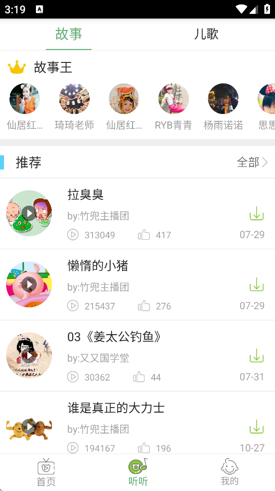 离线下载:在【听听】-【故事】分类中找到内容,点击下载图标缓存。