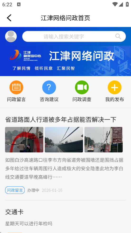 2、高效问政平台:依托江津网已有六年历史的网络问政平台,在最江津上开设问政板块,搭建纳民意解民忧的手机版快捷通道,工作人员点对点转交网民诉求,相关单位在线为百姓解答。每月通过《问政平台月报》公布诉求解决情况,派出记者对网友关注的热点舆情和能解决而拖着不解决的网民诉求跟踪调查。目前问政调查已做了222期,部门回复率超过90%,共解决群众投诉事件5885件,解答网友提问3448个。
