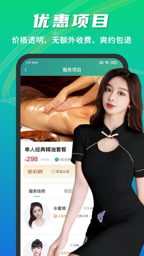 3、选择服务:在首页浏览或搜索,找到心仪的按摩项目(如肩颈放松、足疗SPA),点击进入详情页查看服务说明和价格。