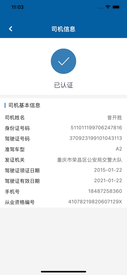 司机认证:身份证正反面、驾驶证主页及副页、从业资格证。