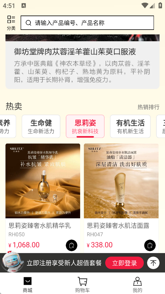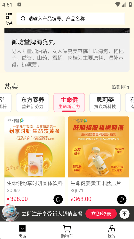 4、在线购物:可浏览三生产品详情、加入购物车、参与促销、支付及管理订单。