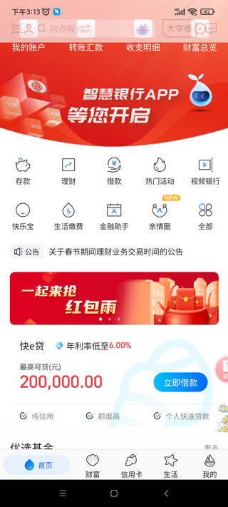 6、贷款服务:支持循环贷款自助放款及信用卡相关业务(激活、还款、积分查询等)。