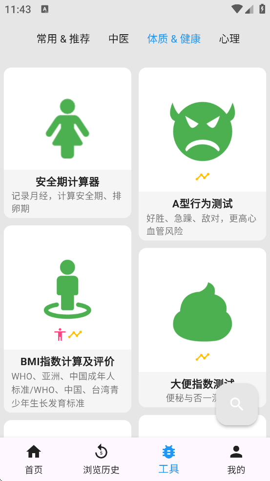 5、医学计算:在"工具"中找到"女性安全期计算器"、"BMI计算"等,输入数据即时计算。