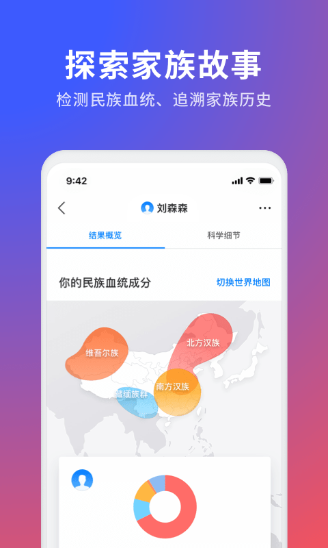 1、祖源追溯:追溯民族血统和家族迁徙历史,支持追溯至68000年前。