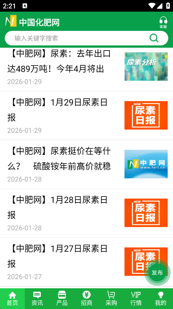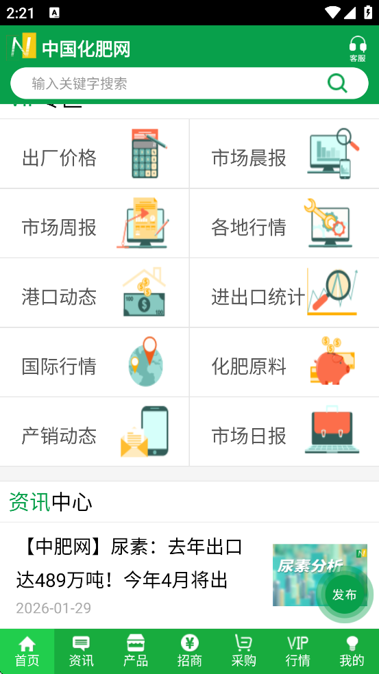资讯页面:点击底部【资讯-功能按钮】,查看最新化肥行业资讯、政策法规和市场分析。