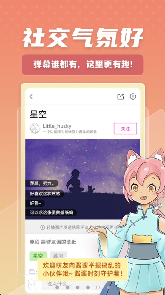 3、社区互动:可关注其他画师、收藏喜欢的作品、点赞评论,甚至寻找约稿机会。