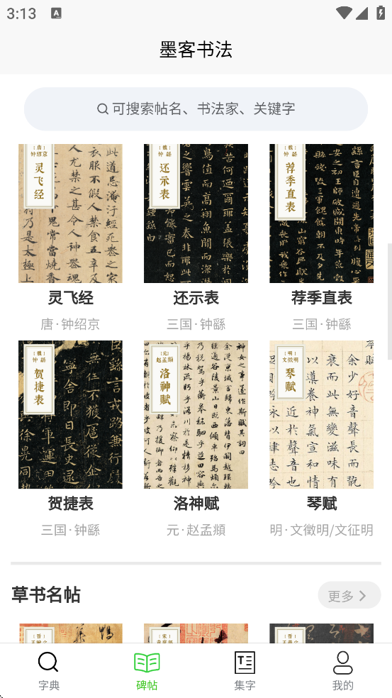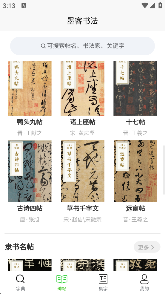 墨客书法字典下载安装手机版是一款书法学习软件,软件内为用户提供海量书法字帖练习,同时软件内为用户提供智能推荐相似的字体,满足用户的练习需求,更多惊喜等你来发现,这么好用的书法学习软件,你还等什么?有需求的小伙伴快快下载前来使用吧!