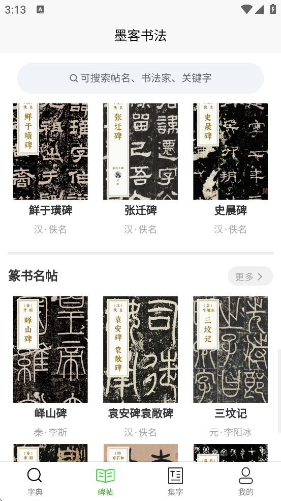 3、支持中国古代著名碑帖的展示与查询,可按朝代、字体(楷、行、草、隶、篆)筛选,快速定位目标资源。