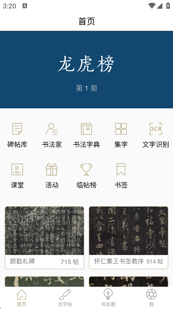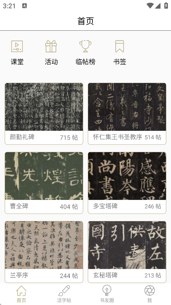 打开App后,首页清晰划分四大核心模块:碑帖库、活字帖、字典集字、我的练习。根据当前目标点击进入,例如想临摹《兰亭序》就选“碑帖库”,想写对联就去“字典集字”。