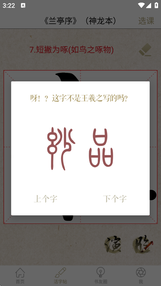 选择对应的原帖范字进行智能对齐,系统自动叠加重影并标注结构偏差区域(如起笔偏移、转折过急)。