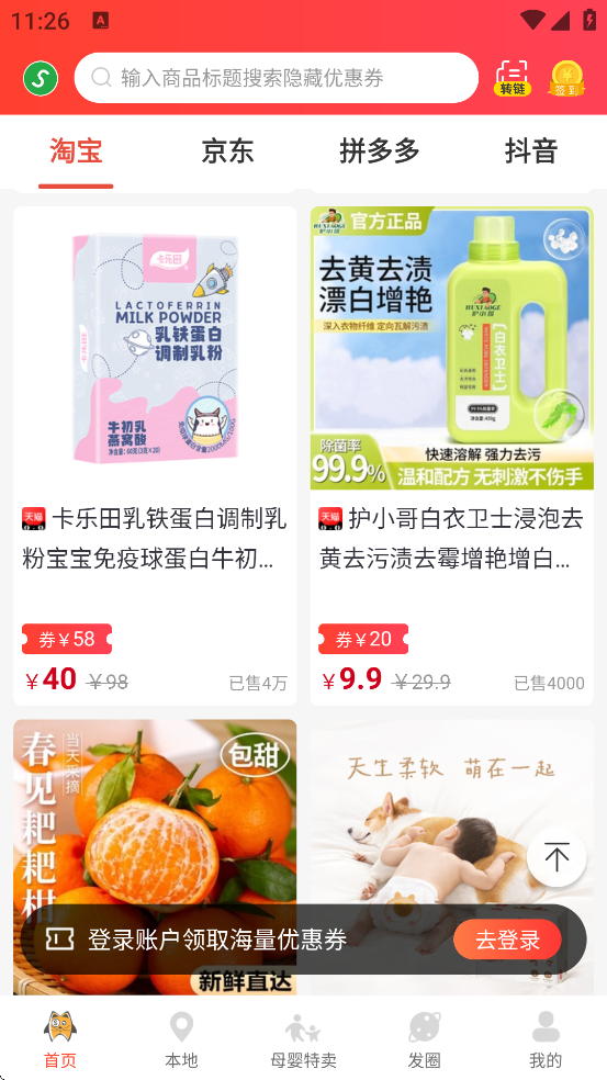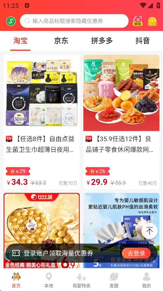 首页设有“咚咚抢”“9.9包邮”“每日半价”“今日上新”等多个板块,每日更新上千款带券商品。