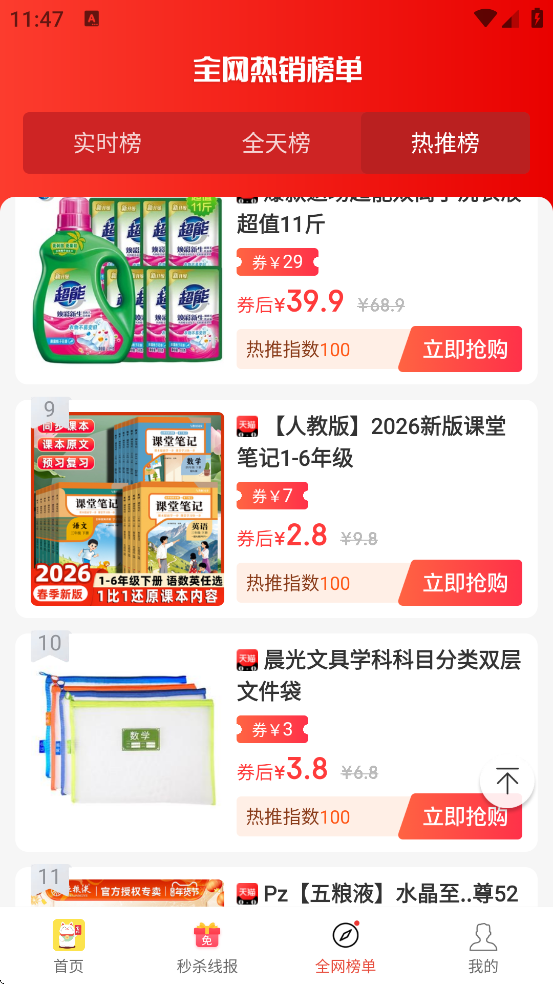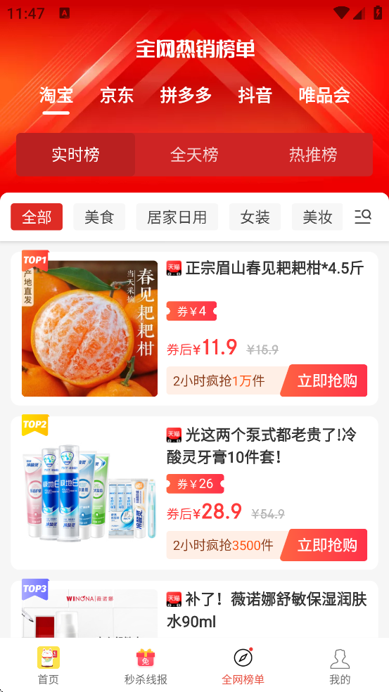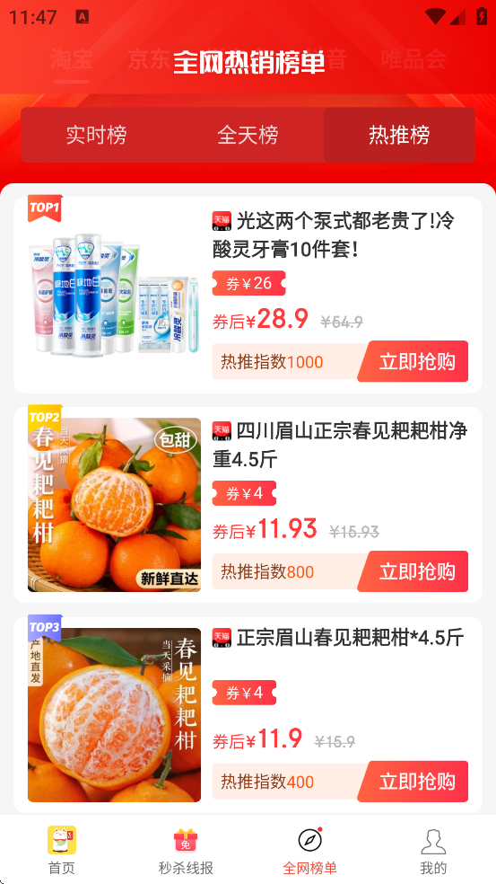 2、实时排行榜单:每2小时更新“疯抢排行榜TOP100”,精选当前最热门的高性价比商品,帮助用户快速发现爆款好物。