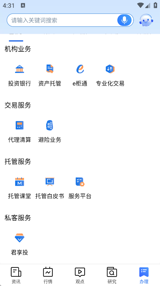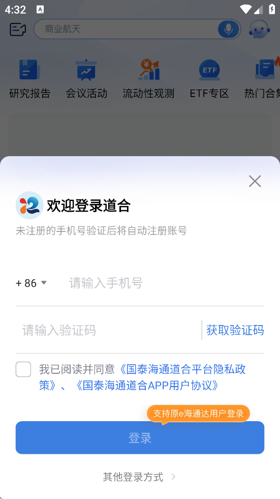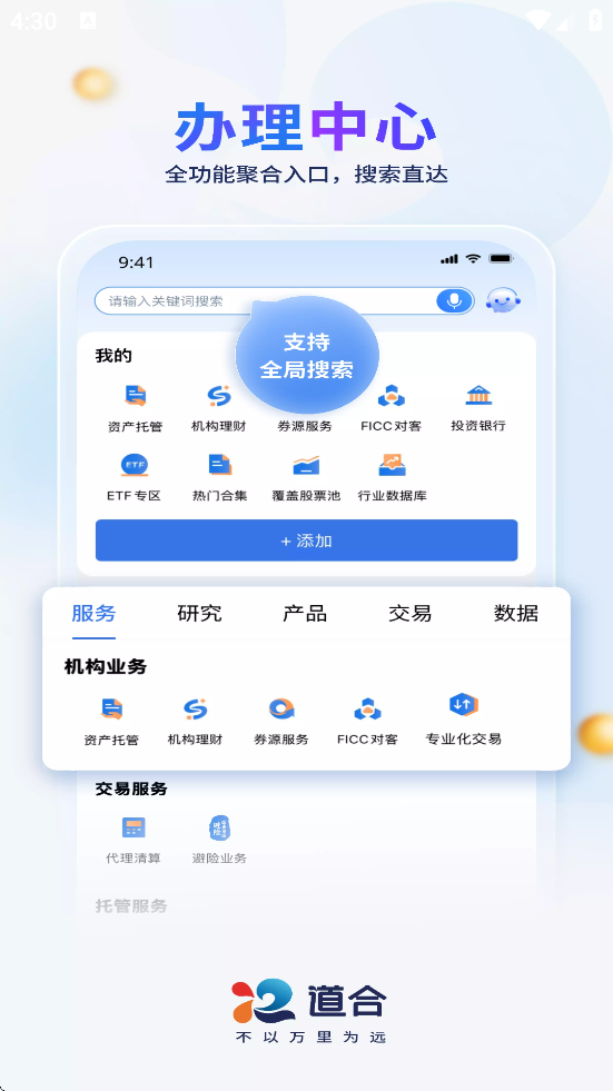 国泰海通道合是一款由国泰海通证券推出的综合性金融服务平台,主要面向机构客户、财富客户及企业用户,提供覆盖投资全周期的专业服务。软件集行情查看、交易操作、理财购买、资讯获取等功能于一体,用户可实时跟踪股票、基金、债券等金融产品动态,并完成便捷交易。平台汇聚国泰海通研究所超40个领域的深度研报与市场研判,支持个性化定制服务,助力客户把握趋势。同时,它还提供资产托管、基金服务、场外金融解决方案、证券借贷等多元业务,满足专业投资者在量化交易、资产配置、投研支持等方面的综合需求。无论是参与线上路演、获取宏观数据,还是进行电子签约与互换交易,国泰海通道合都致力于通过智能化工具和全周期陪伴服务,提升用户的投资效率与体验。
