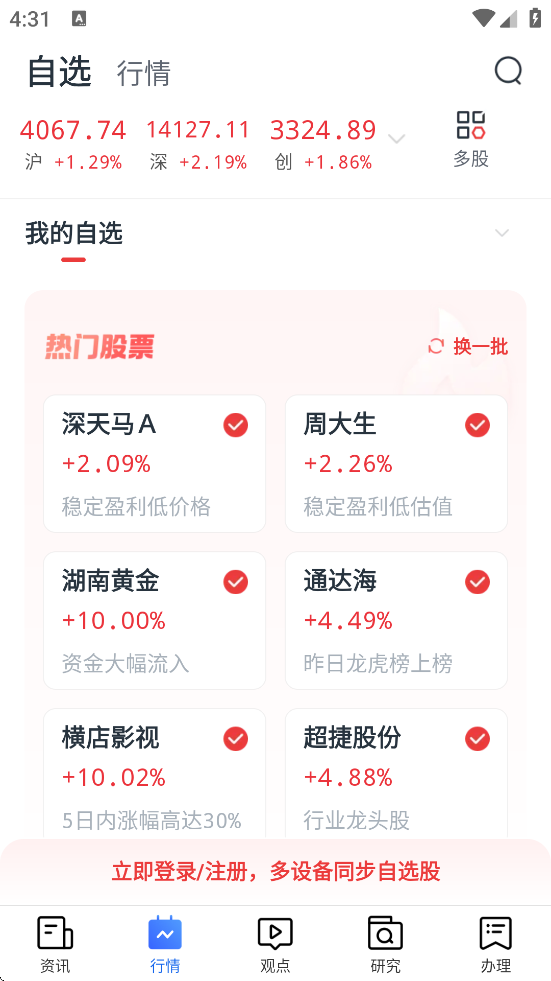 登录后进入首页,点击“行情”栏目,可实时查看股票、基金、债券等金融产品的价格走势,并支持添加自选股以便长期跟踪。