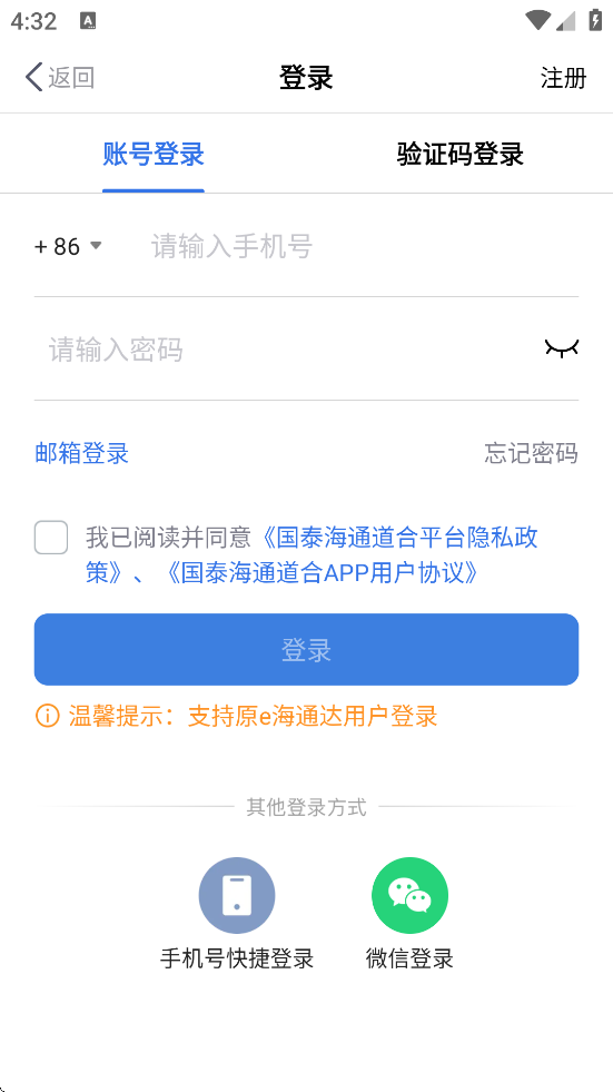 打开APP后点击“注册”,输入手机号并获取短信验证码完成身份验证,设置登录密码后即可登录。
