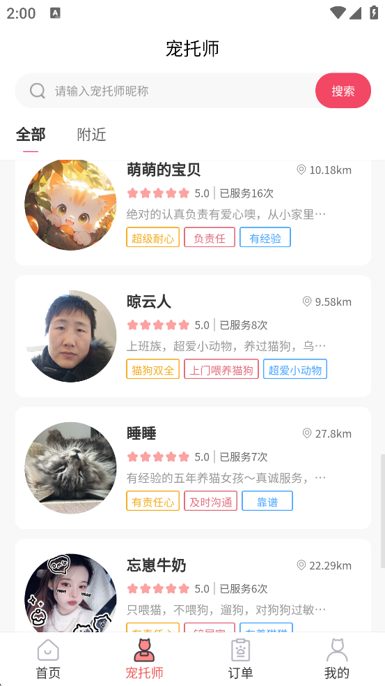 6、可选择“指定喂养师”或由系统智能推荐附近可接单的认证宠托师。