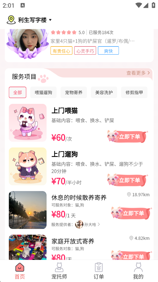 4、进入首页点击“上门喂猫”或“遛狗”等服务类型。