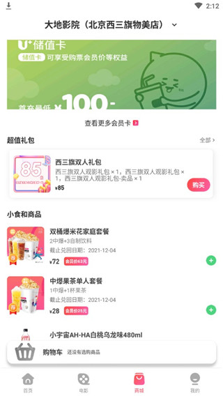 4、用户可在App内购买优惠卖品套餐,如爆米花、饮料等,还可选购“十步”轻食品牌商品,不定期推出限量正版迪士尼毛绒玩具及食品。