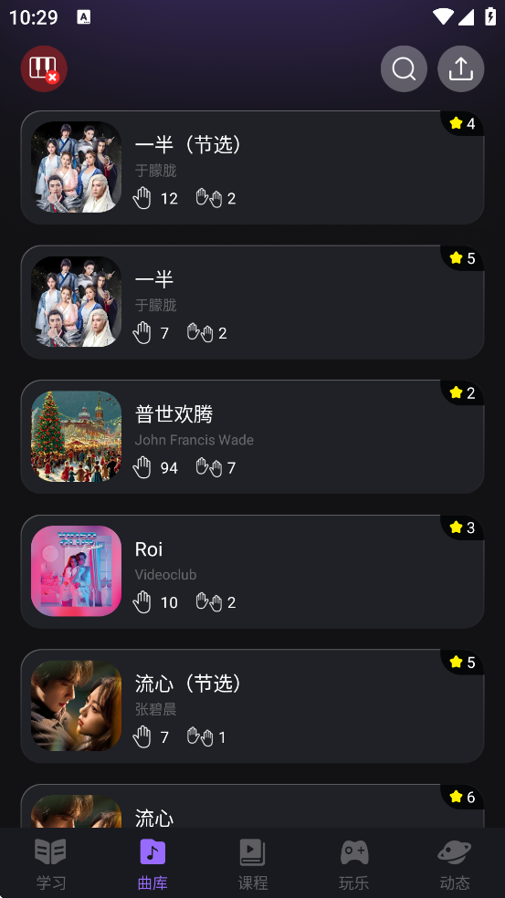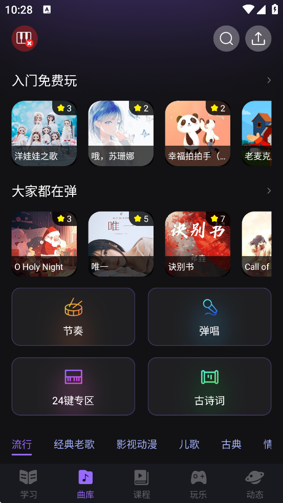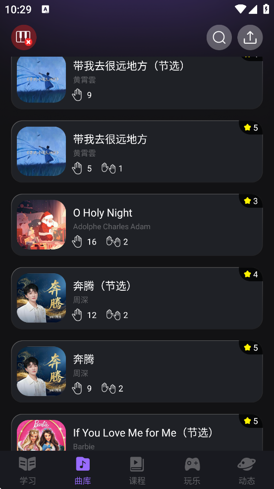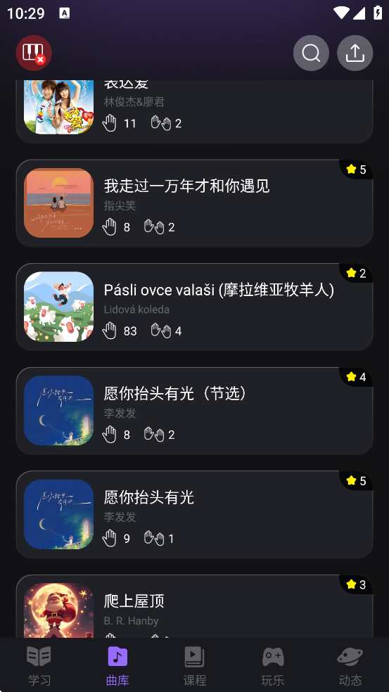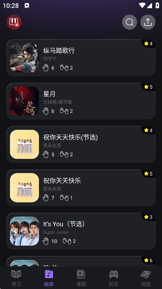 进入“曲库”页面,推荐初学者从一星难度的《小星星》《两只老虎》等经典儿歌开始练习;