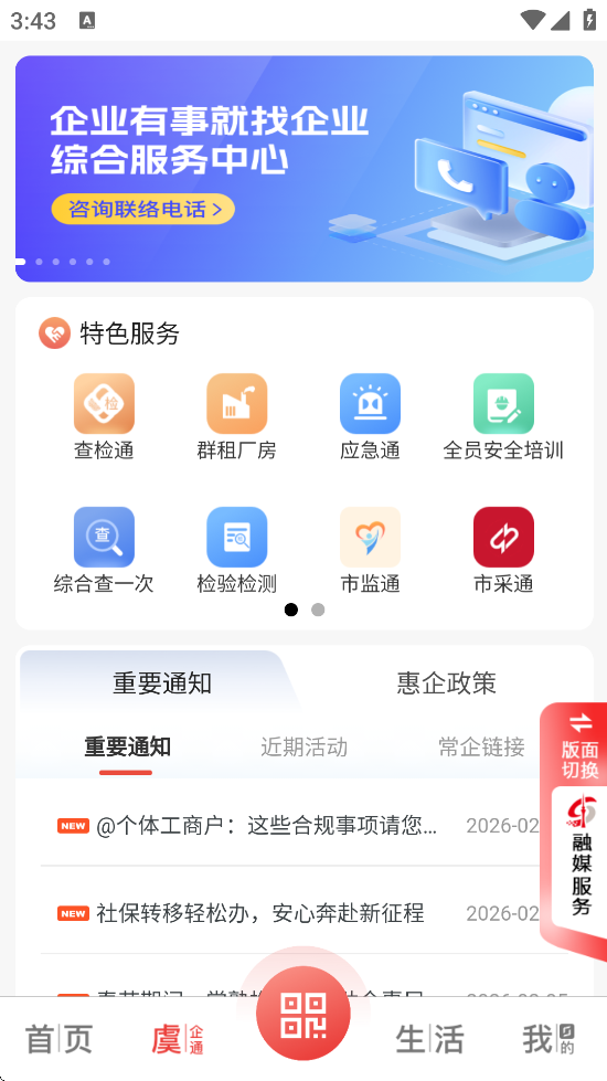 企业用户可点击首页侧栏“虞企通”→进入“查检通”进行出口危险品包装鉴定预约等属地查检服务。