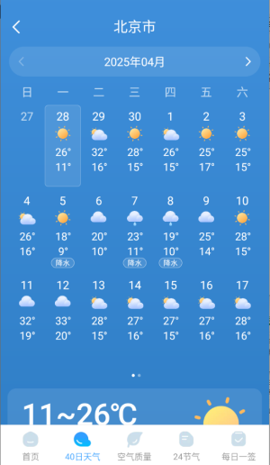 5、提供全国99%地区及全球范围的天气信息,支持未来15天逐日预报和长达40天的超长趋势预测,涵盖温度、湿度、风速、降水概率等关键指标。