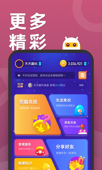 天天趣玩是一款集答题赚钱、任务奖励与日常打卡于一体的手机应用,用户可通过参与知识答题、试玩应用、邀请好友等简单任务获取现金奖励,并支持提现至微信,1元即可到账,每日最多可提现3次。平台涵盖历史文化、地理知识、娱乐明星等多种题型,适合不同兴趣的用户参与,同时设有每日签到和打卡挑战活动,连续参与可获得更高收益。除了答题,用户还能通过看视频、完成注册任务等方式赚取零花钱,实现“边玩边赚”。软件操作简单,任务记录和提现历史清晰可查,适合学生、宝妈、上班族等利用碎片时间增加额外收入。