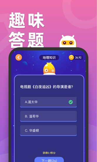 1、平台提供涵盖历史文化、地理知识、娱乐明星、听歌识曲等多领域的题目,用户答对即可获得现金奖励,边学习边盈利。