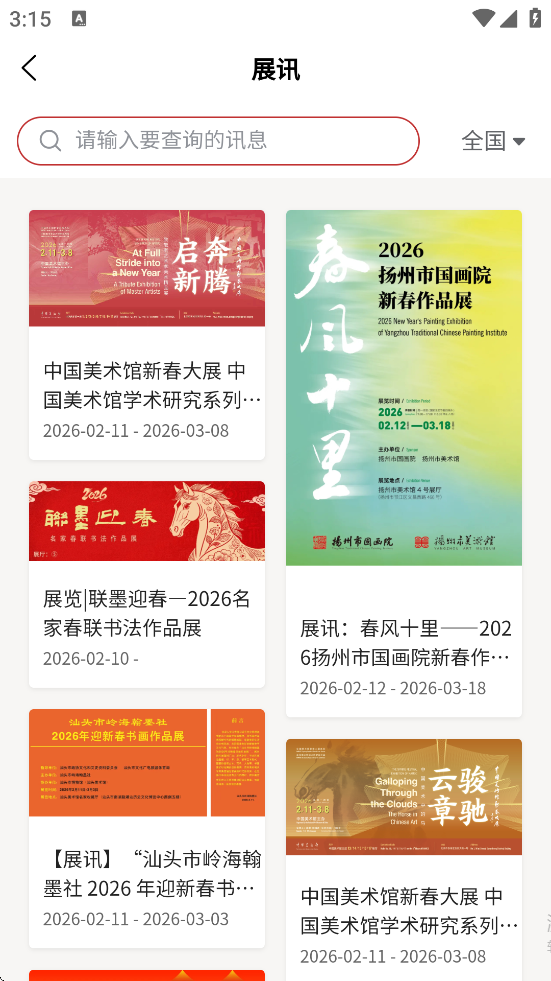 5、实时更新全国书画展览动态与征稿启事,支持按城市、时间筛选,帮助用户掌握行业前沿,规划参展路径。