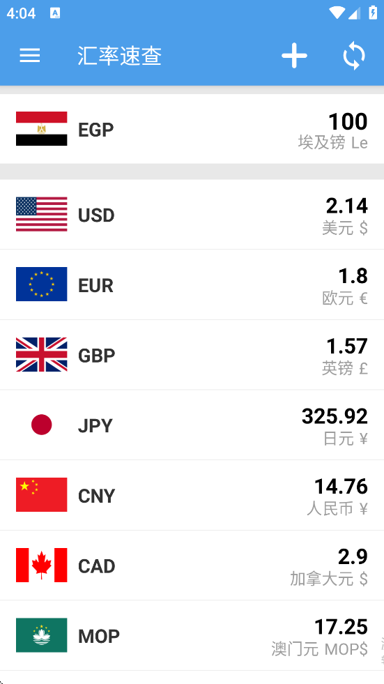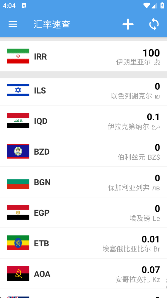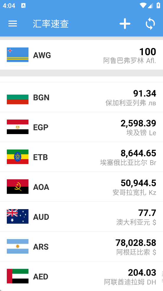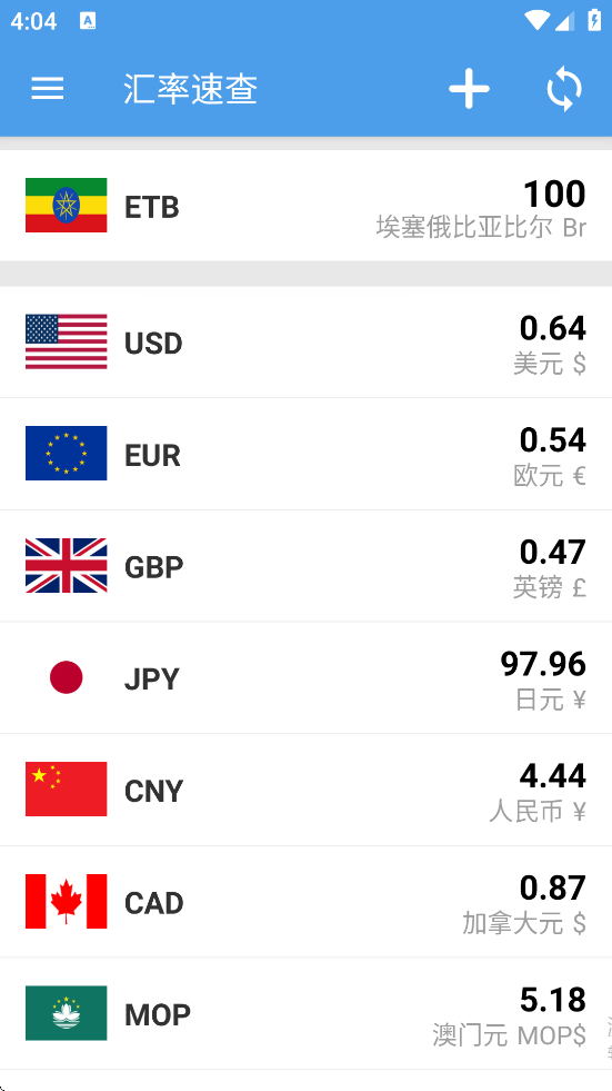 点击右上角“+”按钮,可从160多种货币中选择需要的币种添加到列表;