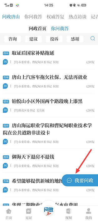 4、提交后,您可返回首页,依次点击“我的”-“我的互动”-“我的问政”来查看问政的处理进度、受理状态及官方答复内容。