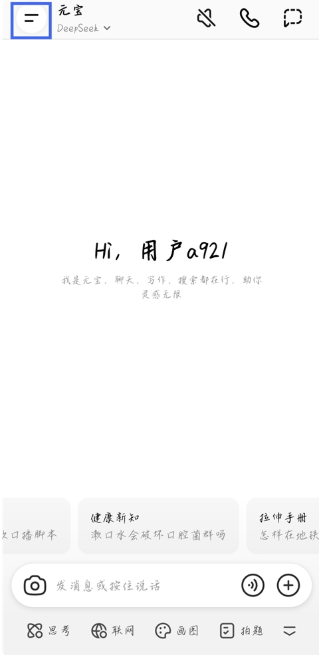 1、打开腾讯元宝 App,点击左上角的「≡」菜单图标;