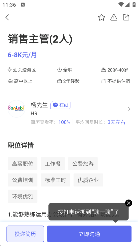 5、实时沟通工具:内置“职聊”功能,支持求职者与HR在线聊天、语音视频通话,实现即时互动。