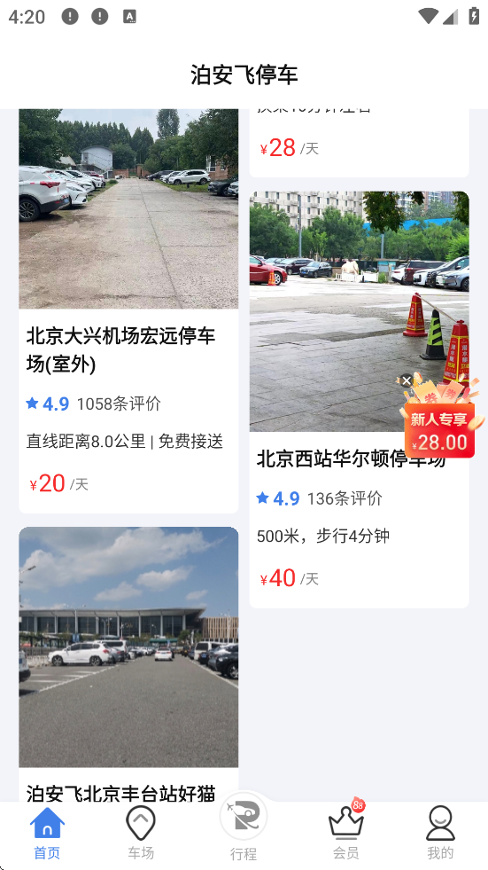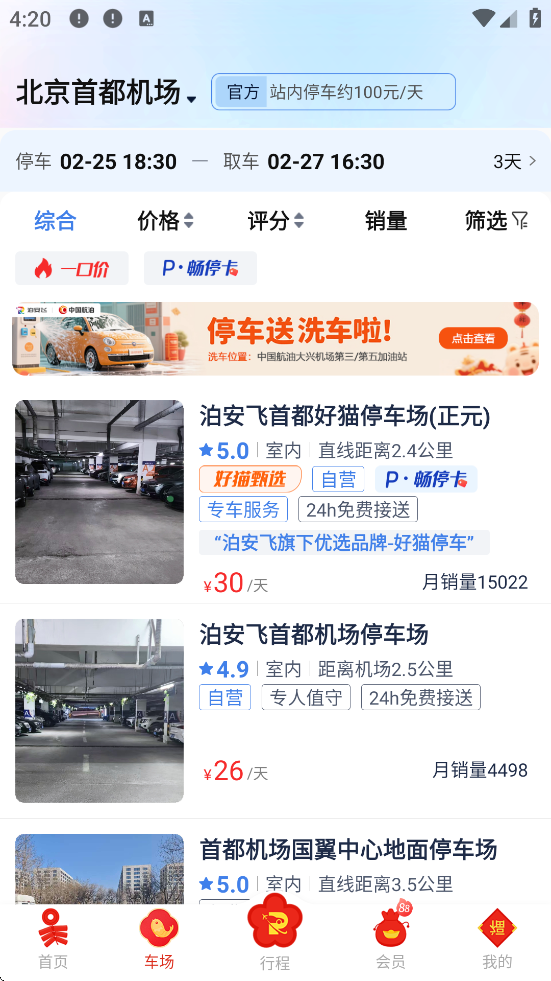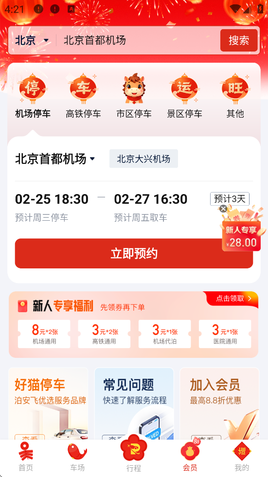 主页点击【预约停车】,选择目的地(如“北京首都机场T3”);