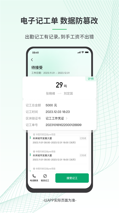 每日工作可通过“一键记工单”记录,系统自动生成带水印照片作为凭证