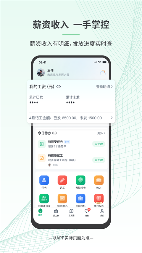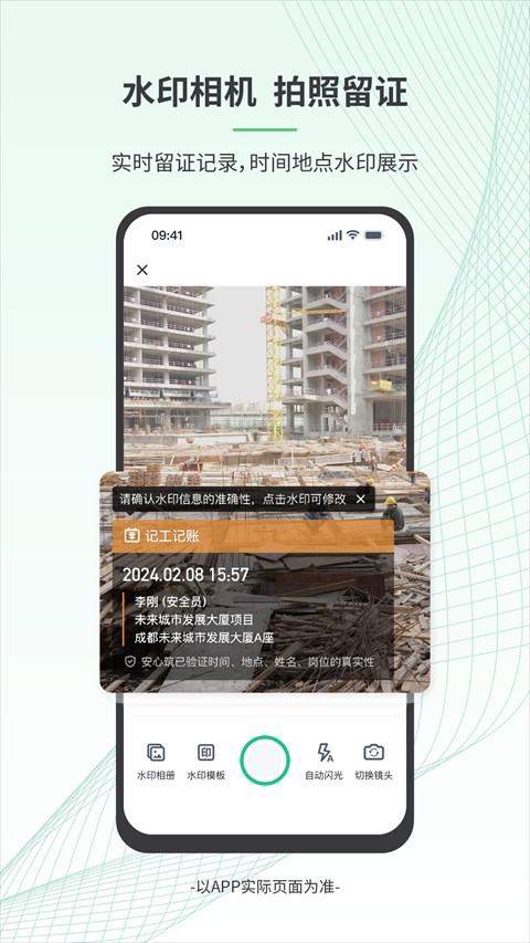 5、工人可通过APP一键打卡、确认记工,系统自动生成带水印的照片记录,确保考勤数据真实可靠。