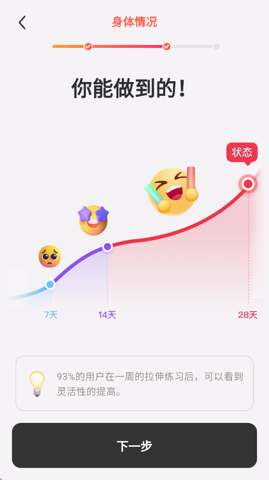 2、根据用户的身体条件(如年龄、体态问题)、训练目标(如减脂、矫正驼背)和时间安排,智能生成专属拉伸课程,支持动态调整强度。