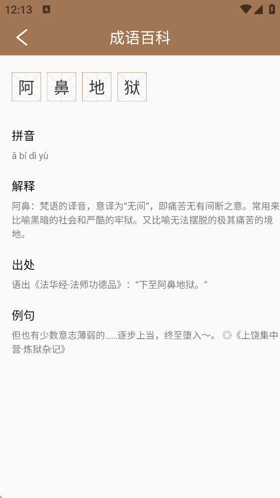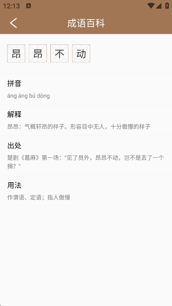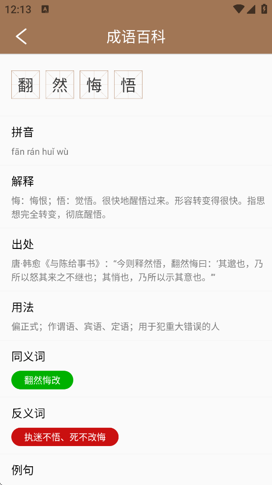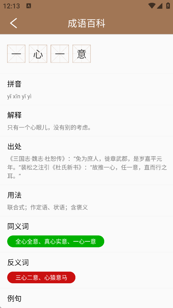 5、收录数万条成语(部分应用达5万条以上),涵盖常用成语、考试高频词、课外拓展内容等,每条成语均提供拼音、释义、出处、典故、例句、语法说明及古代文献引证。