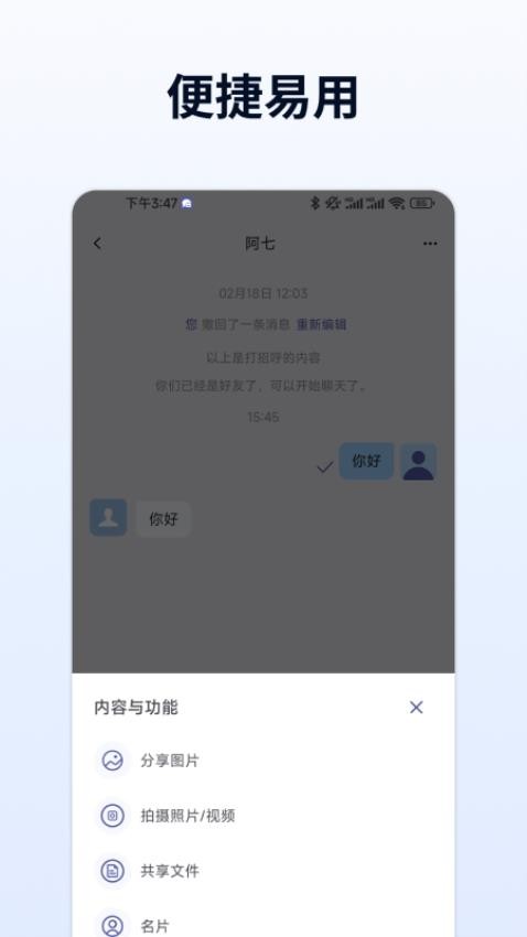 2、支持文本、语音、图片、文件、表情等多种消息形式,满足日常办公沟通需求,消息实时同步于多终端。