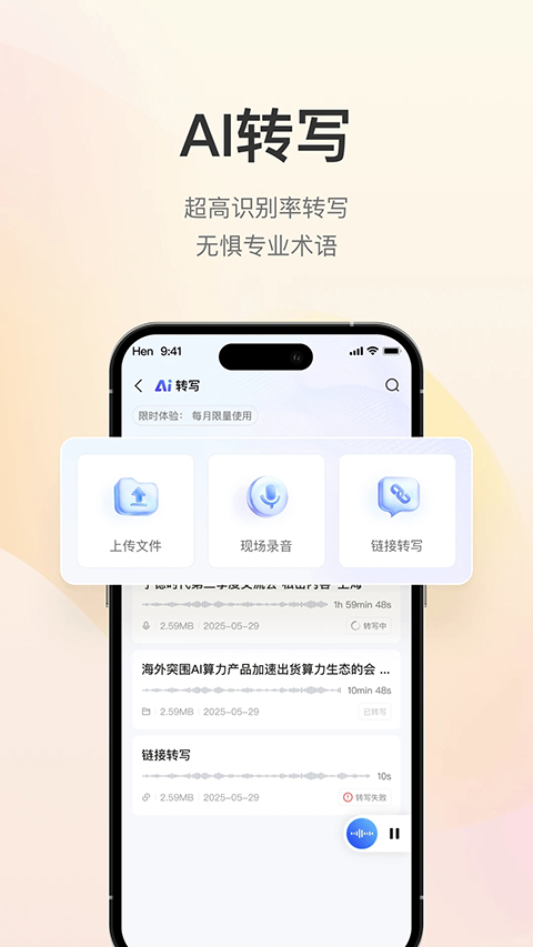 4、AI转写实现高精度语音转文字,AI翻译支持多语种互译,助力全球化信息处理。