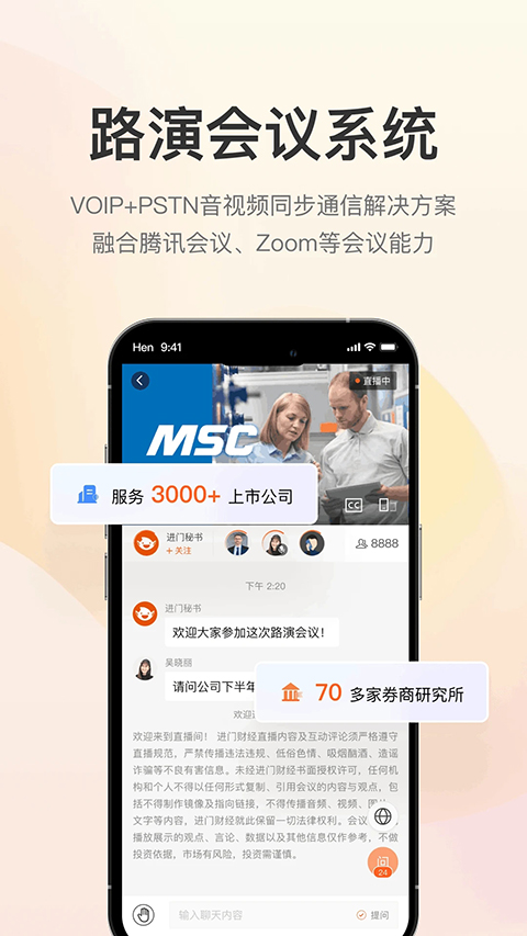 进门财经App是一款专注于金融领域的数字化投资者关系管理(IRM)平台,致力于为上市公司、券商研究所、机构投资者及专业个人投资者构建高效的信息闭环生态。平台以“音视频+PPT同步直播”为核心模式,支持网络会议、电话会议及双通道融合接入,提供公开、私密、白名单、合格投资人专场等多种合规直播场景,广泛应用于分析师路演、上市公司业绩发布会、定增说明会、行业专家解读等专业投研交流场景。