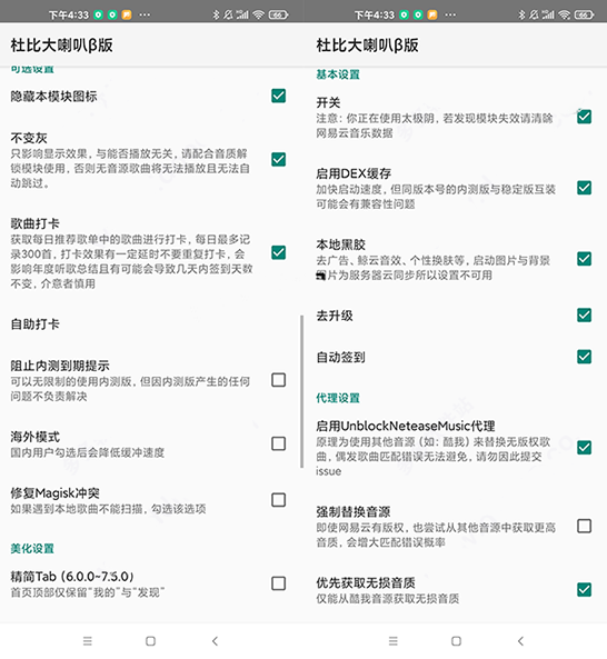 1、杜比大喇叭β是一款网易云音乐的音源代理模块,解锁本地黑胶会员,鲸云音效、自动签到