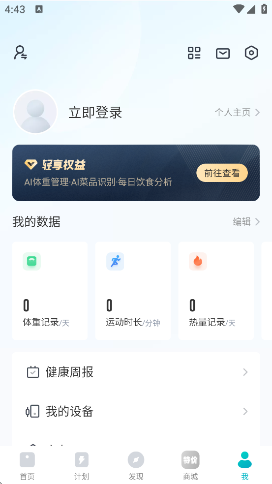 3、首页采用仪表盘设计,关键指标一目了然,配合体重趋势图、健康周报等图表,让用户清晰掌握身体变化轨迹。